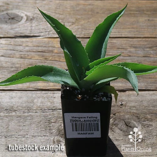 DESCRIPTION:  Falling Waters is a hardy succulent with a rosette of thick blue-green arching foliage, distinctively rippled. Leaf edges are lined with little spikes, and the leaf tip is sharp too. Mangave® is a new range of Agave hybrids, inheriting big bold shapes and resilient sturdiness from one parent, and fast growth and a wide range of colours and markings from the other.