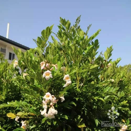 APPEARANCE : Glossy evergreen leaves, clusters of pale-pink-white-gold, lightly-scented trumpet flowers in warm months through the year.